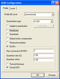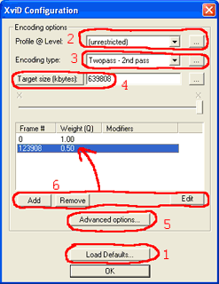 Сегодня, мы рассмотрим кодек Xvid, который претендует на звание "ISO совместимого". Это значит, что он должен проигрываться стационарными плеерами, поддерживающими Mpeg4 стандарт. На практике, это до сих пор не так. Есть 4 реальных конкурента на рынке сильного сжатия видеоматериалов: Divx, Xvid, WMV_VCM и VP6. Между собой совместимы только DivX и Xvid (как последователи стандарта Mpeg4). Я не выделил бы ни один кодек в качестве однозначного лидера. У каждого из этих кодеков есть свои изъяны. Например, Xvid искажает цвета и не очень хорошо работает с материалами, где есть постепенные нарастания и снижения яркости, но у него высокая чёткость на динамических сценах. DivX - менее чёткий, по сравнению с Xvid (опять же, при определённых условиях, это можно назвать плюсом). К WMV_VCM пожалуй меньше всего нарицаний, но он менее чёток на динамических сценах, по сравнению с Xvid. А вот про VP6 отдельный разговор. О нём написана хорошая статья Виктором Томиловым. Теперь приступим непосредственно к виновнику. Вы можете спросить - а чем собственно Xvid, мне больше нравится? Отвечу - он мне больше подходит по причине качественной работы с динамическими сценами. Мне очень часто приходится заниматься сжатием "домашнего видео", а оно, как известно, не блещет качеством съёмки. Всё это снимается без штатива, естественно, картинка ходит ходуном. При этих условиях, только Xvid после сжатия, сохраняет максимальную деталировку. Кодек Xvid постоянно обновляется. Это результат того, что его код является открытым и любой, кому это интересно, может принять участие в доработке программы. Первоначальный код переписывался 3 раза полностью. Последние версии (альфа и бета) уже совместимы с кодом ISO Mpeg4. Это значит, что фильмы, сжатые при помощи кодека Xvid, будут нормально просматриваться декодером DivX. По моему мнению, декодер DivX более качественный, чем собственный декодер Xvid. Начнём. Для сборки фильма я использую программу VirtualDub. Это очень простая программа. Захват в ней я описал, а обычная работа с VirtualDub описана во многих статьях и повторятся я не буду. После запуска VirtualDub и открытия в нём вашего видео вы должны будете произвести настройку фильтров (его я опишу в другой статье). Когда этот этап пройден, вам нужно сжать исходный материал кодеком с сильным сжатием для дальнейшего хранения и просмотра. Мы договорились, что это будет Xvid. На момент написания статьи, была выпущена версия Beta2, которую можно скачать с сайта. Я опишу работу с этой версией. После того, как вы произвели монтаж своего фильма и произвели настройку фильтров, нужно настроить кодек. Для запуска настройки кодека Xvid, нужно произвести последовательность действий, отображённую на рисунке. После запуска конфигурации кодека, вы увидите окно настройки кодека: Для большего удобства я ввёл свои условные пункты от одного до шести. Далее, при описан кодека, я буду отталкиваться от этих пунктов. Если у вас раньше была установлена другая версия кодека Xvid, то после запуска окна настройки кодека нужно обязательно установить кодек по-умолчанию. Для этого нужно нажать на кнопку помеченную цифрой 1. В случае каких-то проблем при кодировании, так же может потребоваться установка кодека в дефолтное состояние. Цифрой 2 помечены две вкладки. Первая из них - выпадающее меню. Здесь сделаны стандартные предустановки, которые должны быть совместимы с аппаратными проигрывате