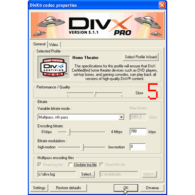 Положение "Standard" работает аналогично самому медленному режиму кодека DivX 5.05. В этом режиме работают все функции кодека.