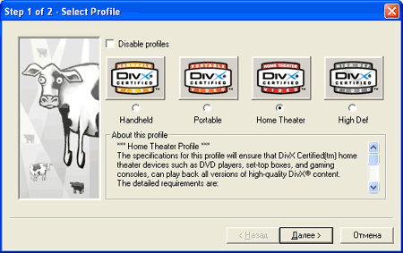 Здесь можно выбрать какой-нибудь профиль или отключить их и произвести все настройки на своё усмотрение. Чекбокс "Disable profiles" отключает использование профилей. При этом, выдаётся предупреждение о том, что полученное видео может не проигрываться на устройствах, совместимых с Divx (аппаратных проигрывателях). Посмотрим, что повлечёт за собой включение любого из этих профилей или их отключение.
