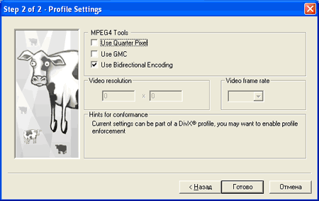 На вкладке "General" находятся настройки кодека, относящиеся к самому кодеку. Начнём сверху. "Selected profile". Здесь можно произвести настройку профиля работы кодека. В качестве настроек, управляемых из профиля выбраны: Quarter Pixel, GMC (Global Motion Compensation), Bidirictional Encoding, Video Resolution и Video frame rate. Теперь обо всём по-порядку. Нажав на копку "Select profile Wizard" попадаем в это меню: