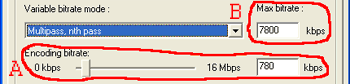 "Multipass, n th pass" - Это следующий после первого прохода режим. Если мы поставим его после первого прохода и уберём галочку "Update log file" в поле 5, то можно будет на этом закончить - мы получим готовый к просмотру файл видео в двухпроходном режиме. А можно ещё немного улучшить качество сжатого материала. Для этого, оставляем на месте галочку "Update log file" (которая стоит по-умолчанию) и делаем второй проход. При этом происходит обновление файла статистики. Далее, повторяем этот проход, но со снятой галочкой "Update log file". Это уже получится не двух проходное видео, а трёх проходное. Для этого режима задаётся битрейт, с которым будет кодироваться фильм (А) и максимально достижимый битрейт на динамических сценах (В).