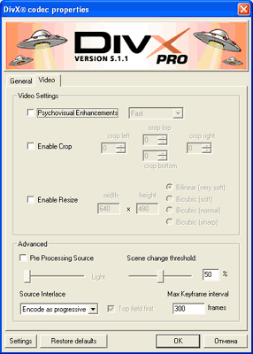 Алгоритм работы "Bicubic" на много более качественный, чем "Bilinear", но при уменьшении картинки это качество зачастую не востребовано. Таким образом, для уменьшения картинки можно рекомендовать "Bilinear" режим, а для увеличения картинки "Bicubic". "Pre Processing Source" - при включении этой опции включается подавитель шума. Он работает как во временной области, так и в пространственной. Работа этой опции видна на глаз - происходит сглаживание картинки. Для материалов, кодируемых в DivX, это может принести как пользу, так и вред. Польза от сглаживания картинки состоит в том, что кодеку будет проще работать и для получения качественного видео на выходе кодека потребуется меньший битрейт. Вред от сглаживания картинки состоит в том, что при этом теряются мелкие детали изображения и происходит размытие границ изображения. В положении "Extreme" происходит максимальное сглаживание, в положении "Light" - минимальное сглаживание. Включать эту функцию я вам не рекомендую. Для подавления шумов написано много фильтров которые подключаются к программам Virtualdub и Avisynth. Они работают на много более качественно. "Scene change threshold" - эта функция отлавливает порог изменения сцен, при котором нужно вставлять ключевой кадр. Как я уже говорил, кодер, при сравнении соседних кадров, разбивает их на текстуры и перемещаемые блоки. Если в предыдущем кадре не нашлось похожего блока, он регистрируется как новый блок. При поиске порога изменения сцен производится подсчёт количества этих блоков. Если их количество будет больше, чем выставлено в "Scene change threshold", то кадр будет закодирован как ключевой. Если выставить это значение слишком низким, то кодер будет часто отлавливать изменение сцен и сжимать кадры как ключевые, а это неблагоприятно скажется на размерах получаемого видео. Рекомендую ставить не менее 20%. Эта функция работает только если движок "Performance/Quality" будет выставлен в положение "Fastest" или "Standard". В положении "Slow" и "Slowest" работает собственный детектор сцен. "Max key frame interval" - здесь можно выставить максимальное количество дельта кадров между ключевыми. Поясню, как это работает. Допустим, у нас идёт кодирование и после ключевого кадра подряд идут только дельта кадры. По прохождении количества кадров выставленного в "Max key frame interval" ключевой кадр будет выставлен автоматически. По умолчанию стоит 300, что соответствует 10-12 секундам, в зависимости от частоты кадров кодируемого материала. Я же рекомендую ставить 50-100, что соответствует 2-4 секунды, это несколько увеличивает размер конечного файла, но вместе с этим облегчает поиск нужного фрагмента, и улучшает качество (ведь в течение этого интервала кодек не показывает кадр целиком, а получает из ключевого, путём передачи изменений оного, при этом возможны любые искажения). "Source Interlace" - В этом пункте определяется, какое видео будет у нас на входе и каким образом кодек должен обрабатывать это видео. Имеет 3 положения: "Encode as progressive" - на входе обычное прогрессивное видео и с ним ничего не делается кроме сжатия. "Encode as interlaced" - на входе кодека чересстрочное видео. Для сжатия чересстрочного видео кодек включает сжатие по полям. "Deinterlace all frames" - на входе кодека чересстрочное видео. Кодек конвертирует из чересстрочного видео в прогрессивное. Алгоритм работы в этом режиме неизвестен. Поэтому, включать этот режим для деинтнрлейса я бы не рекомендовал. Лучше пользовать