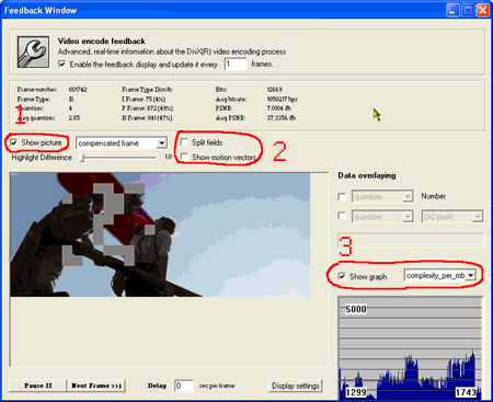 Под цифрой 3 в выпадающем меню можно выбрать, что будет показываться на графике. Можно вообще отключить вывод любого графика ("Show graph"). Среди режимов отображения: - "PSNR" - показатель качества изображения.