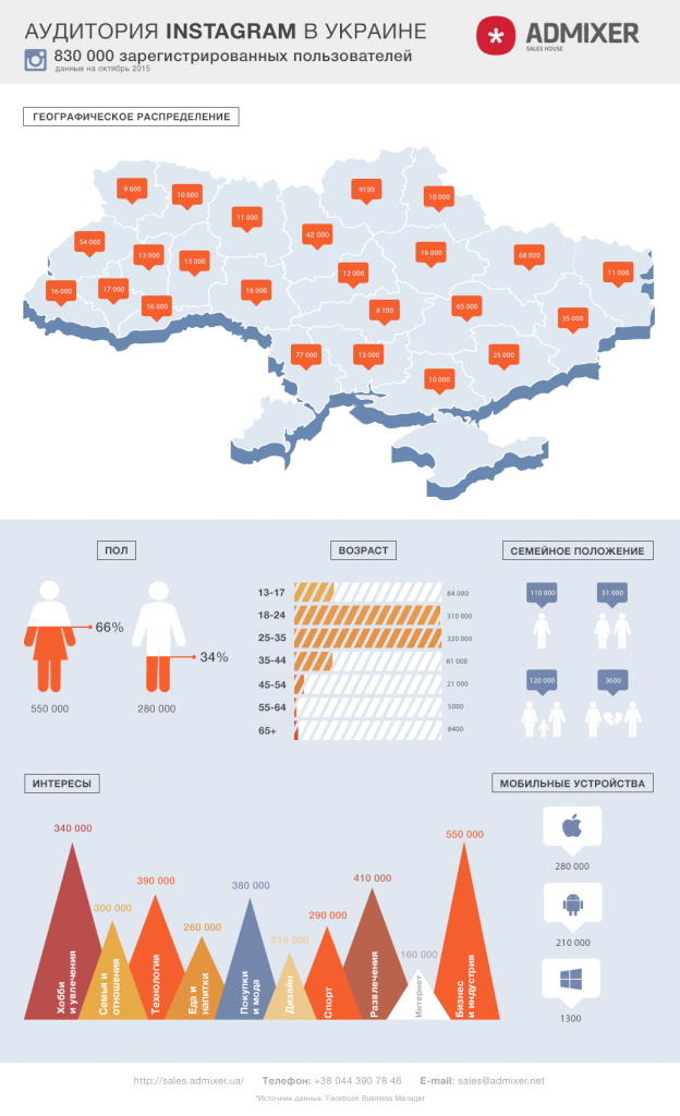 В сентябре этого года для украинских рекламодателей появилась возможность размещать рекламу в Instagram. На сегодня этим сервисом пользуется более 800 тысяч украинцев. 2/3 пользователей — женщины. Среди лидеров Одесская, Харьковская, Днепропетровская области и Киев. Больше об украинской аудитории Instagram вы сможете увидеть в инфографике, подготовленной компанией Admixer.